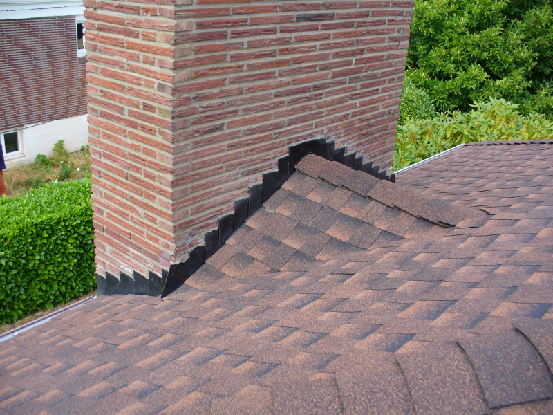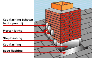 Chimney flashing consists of several parts as shown in the illustration. Chimney flashing prevents water from entering at the point where the chimney and the roof meet. Typically, step flashing is used along the edges of the chimney stack. Leaks often occur at the chimney when flashing fails. Damaged flashing can be cemented or patched; however, it is also a sign that the roof may need to be replaced sooner than later. Every chimney is different, so installing chimney flashing is often a custom project. In most cases, chimneys are not attached to the frame of the house. As a result, when the house settles or shifts, the chimney becomes the perfect place for leaks. Other times that the chimney flashing will need to be replaced include when it is missing, when it is rusted through, when it is totally covered with roofing tar, or when the shingles are going to be replaced.